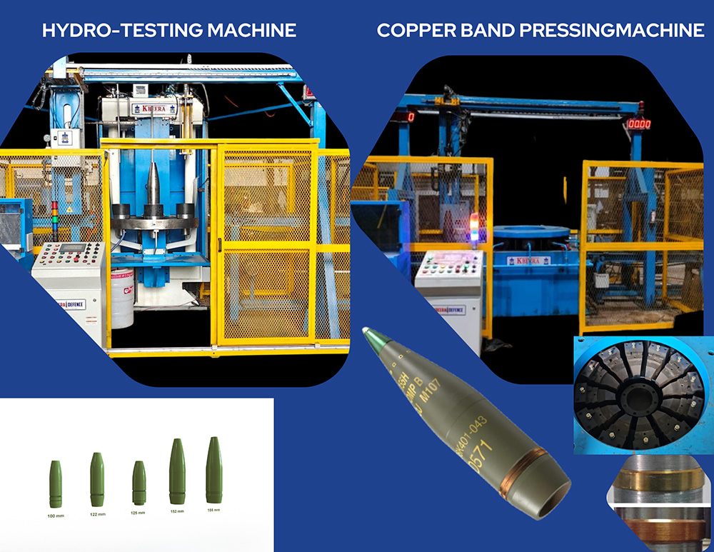 We are pioneers in designing and manufacturing artillery shell testing and band crimping machine for NATO -Standard calibres like M107, M795, M483A1 155 mm projectiles and have supplied to various government and private sectors industries. The machine is designed to test the component for its strength to withstand extreme conditions and also helps in identifying its weaknesses for further improvement. The component is tested on extreme pressure of 1200 -1800 bars depending on its parameters. Our machine is equipped with various safety features such as armoured enclosure for testing, mechanical safety, electrical safety, hydraulic safety etc.